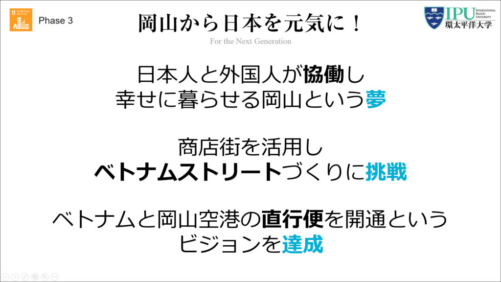 2022年は「IPUジビエ」、2023年は「IPUエシカルアスリート」として3年連続ファイナリストとして挑戦した2024年のテーマは、「IPUカルチャー」。これは、「ベトナムと岡山の架け橋になり、日本で一番ベトナム人が幸せに暮らせる岡山をつくる」をパーパスに取り組んだブランディング事例です。