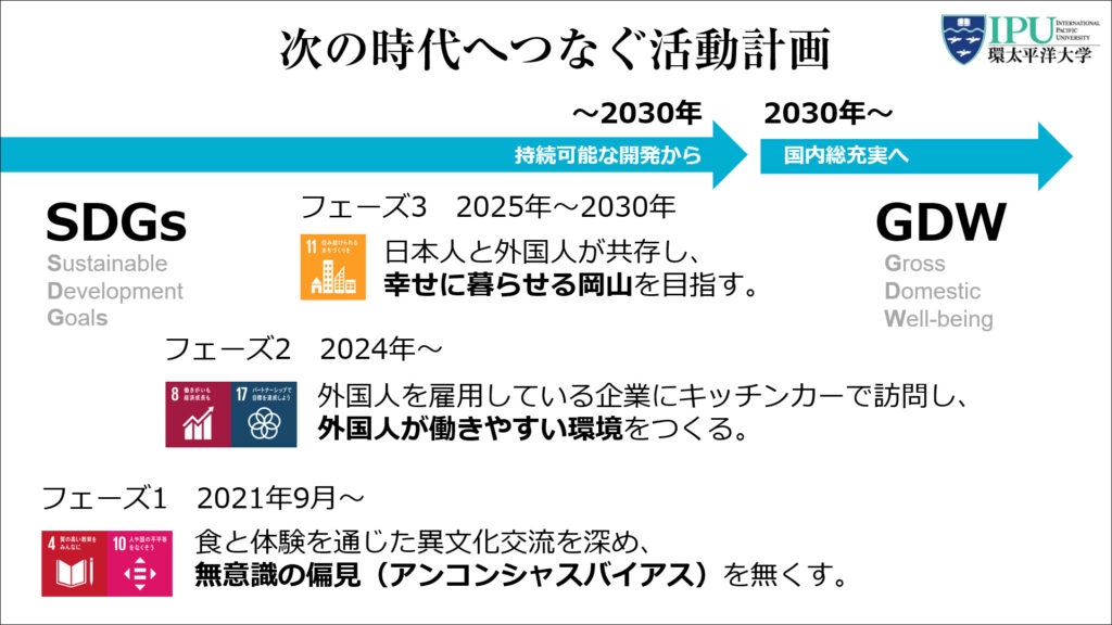 まず、2030年のブランドビジョンを「ベトナムと岡山空港の直行便を開通させる」と決定。市場機会は「食と体験を通じた異文化交流」とし、バックキャストから「無意識の偏見をなくし、外国人が働きやすい環境を作り、幸せに暮らせる岡山を目指す」という3段階のSDGsドミノによる計画を立てました。