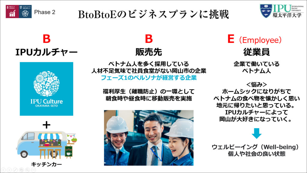 さらに、地域の方々向けに防災をテーマにした交流会「IPUフェスタ」も開催しました。 学内のビジネスプランコンテストがきっかけでキッチンカーが導入されることになったことからフェーズ2に移行し、BtoBtoEのビジネスプランに挑戦。