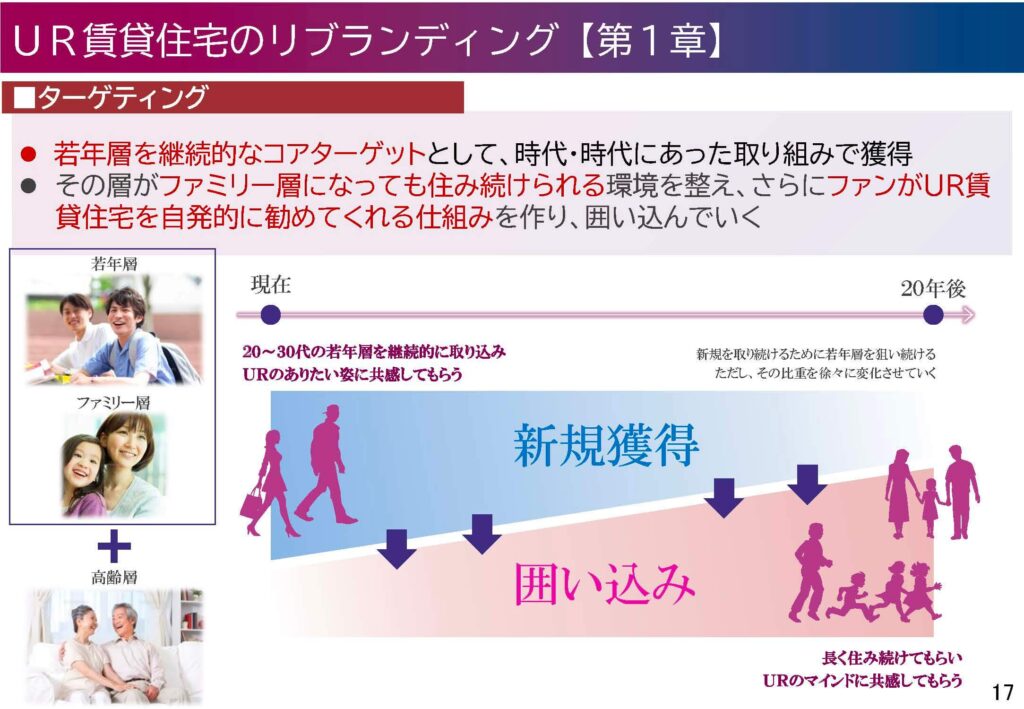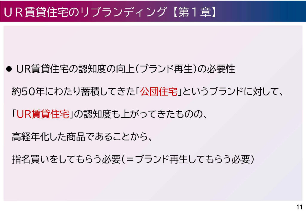 「UR賃貸住宅のリブランディング」は、「UR賃貸住宅の2つの老い」と「認知度」という課題をブランディングの力で解決した事例です。2014年当時、UR都市機構では「建物の老朽化」、「居住者の高齢化」と、「UR賃貸住宅の認知度」という課題を抱えていました。そこでCMやウェブサイト、ロゴを統一したほか、差別化ポイントを明確にして「選ばれるUR賃貸住宅」を目指しました。