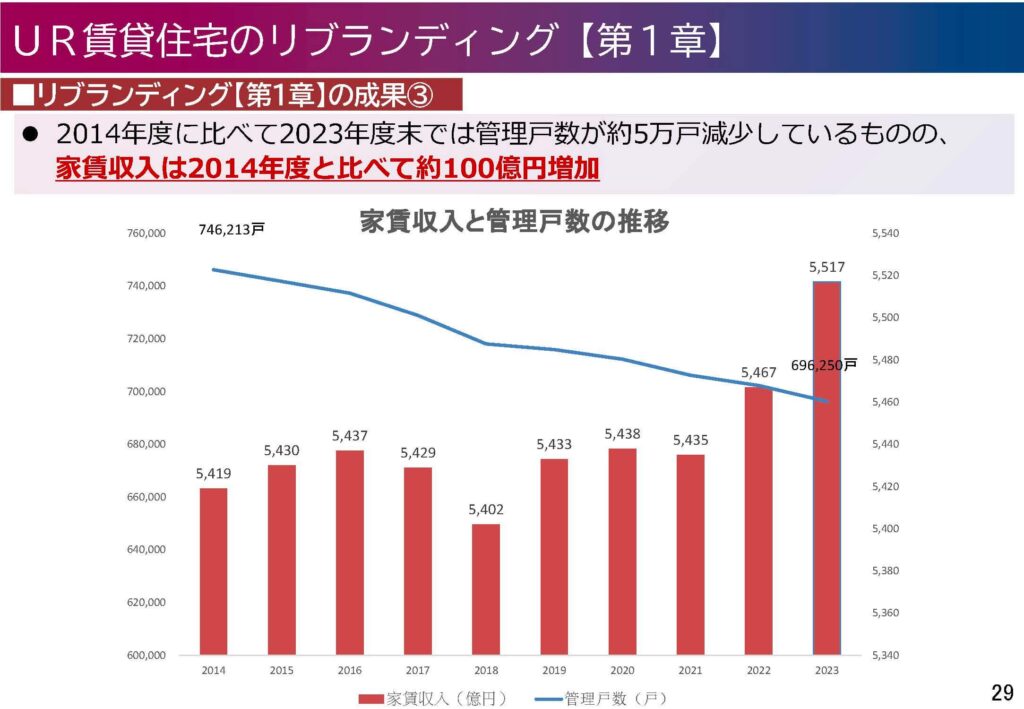 コミュニケーション戦略はマス広告、ウェブ、店頭と、一貫性を持って展開。2016年から開始した「URであーる」のCMで認知度が向上し、これらの効果でブランド再認、ブランド再生ともに2016年以降、スコアが上昇傾向に。若年層スコアも上がり、平均世帯年齢の上昇カーブも緩やかになり、家賃収入は2014年と比べ2023年は約100億円増加しました。