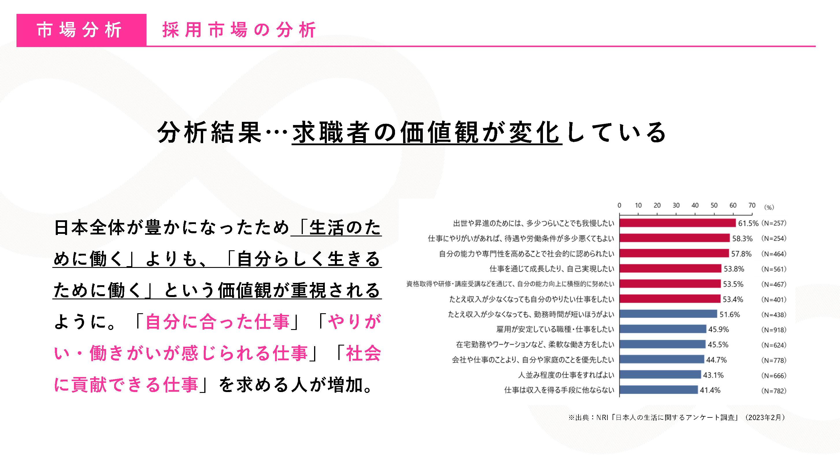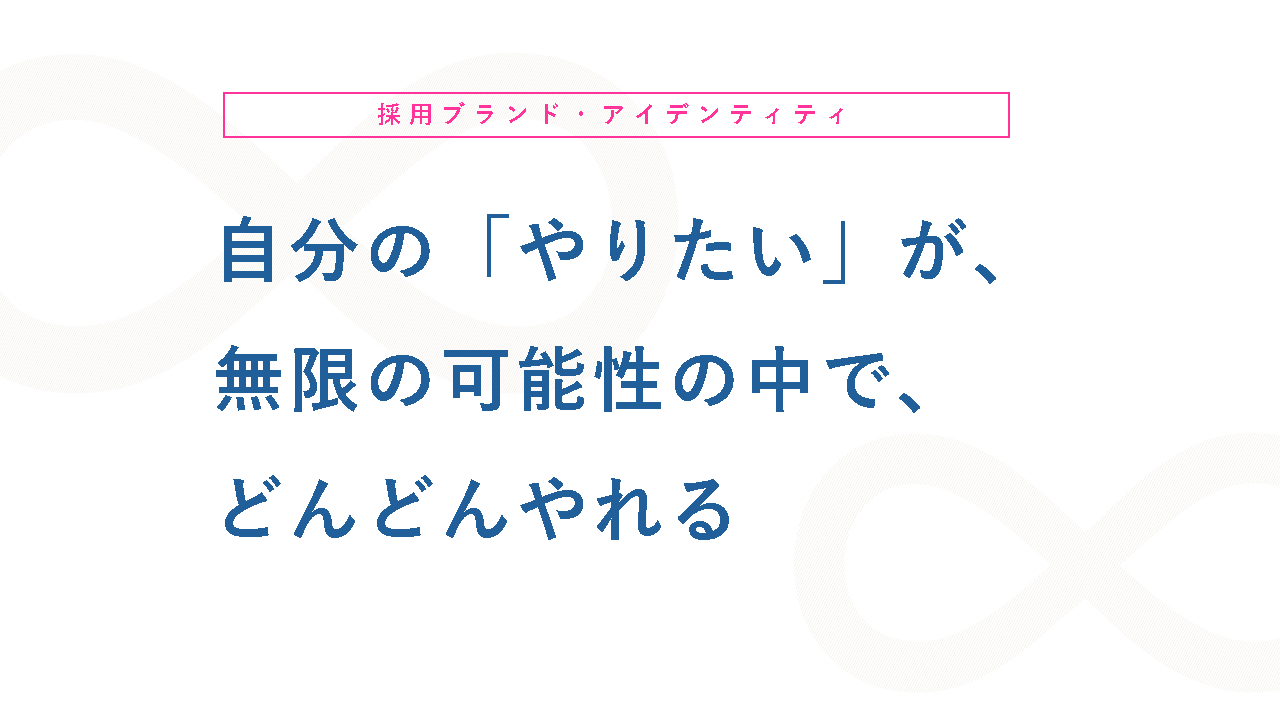 ブランディングでは、ほかの介護事業者との違いを明確化するために、職員へのインタビューを実施。そこで得た情報をもとに「職員のチャレンジを全面的にバックアップする」「自ら主体的に取り組める自由さがある」などの強みを発見。そこから「自分のやりたいことがのびのびとやれる、どんどん追求できる環境があること」が“高坂福祉会らしさ”であると捉え、採用ターゲットは「ご利用者のためになることを既存の枠にとらわれず自ら主体的に考え、つくり、提供できる人」と設定。採用ブランド・アイデンティティは「自分の『やりたい』が、無限の可能性の中で、どんどんやれる。」と決めました。また、「やれること∞むげんだい」というタグラインを作り、タグラインをベースにしたロゴも制作しました。求人広告では、職員の「やりたいこと」がやれる環境であることを全面訴求したほか、面接では「入職して、やりたいことは何ですか?」と質問するなど、「やれること∞むげんだい」を選考基準に設定。さらに若手職員が主体となってSNSで採用広報を展開したほか、地元FM局に職員が出演して魅力をPRしました。