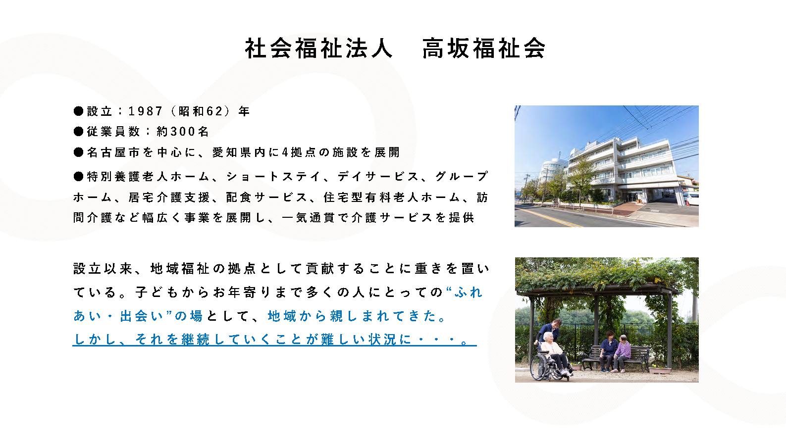 「~やれること∞むげんだい~ 採用数4倍増!介護業界の深刻な人手不足を救った採用ブランディング」は、愛知県内に4拠点の施設を展開し一気通貫で介護サービスを提供している社会福祉法人 高坂福祉会の採用ブランディング事例です。同法人では、介護業界における深刻な人手不足の影響により、人材の確保が困難に。その状況を打破するために採用ブランディングに着手しました。