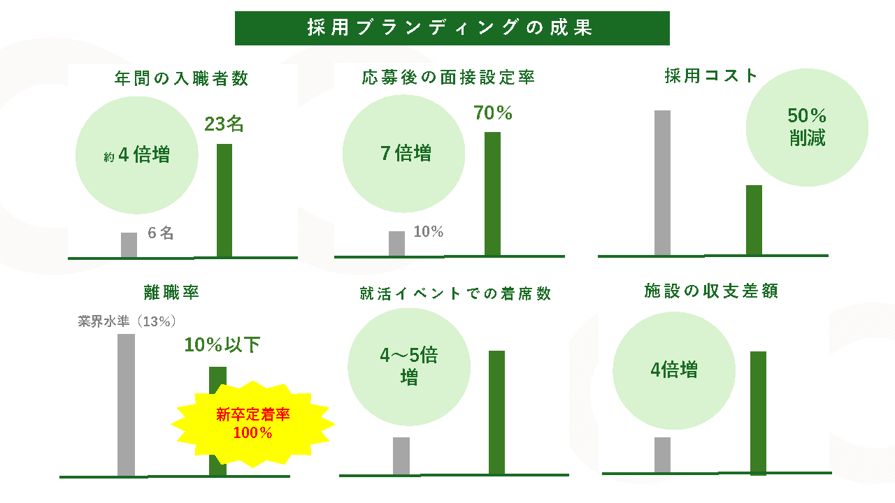 こうした採用ブランディングの結果、入職者数はブランディング前の約4倍増、応募後の面接設定率は約7倍増となり、採用コストは約50%の削減に成功。新卒定着率は100%に、施設の収支差額は4倍増になるなどの成果を生みました。