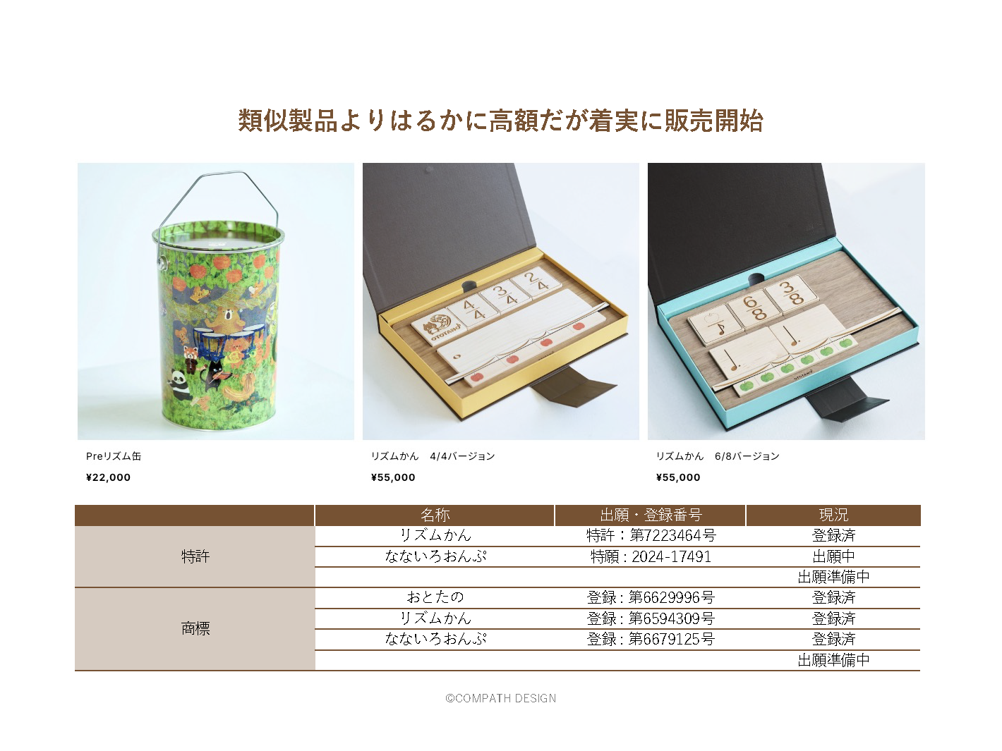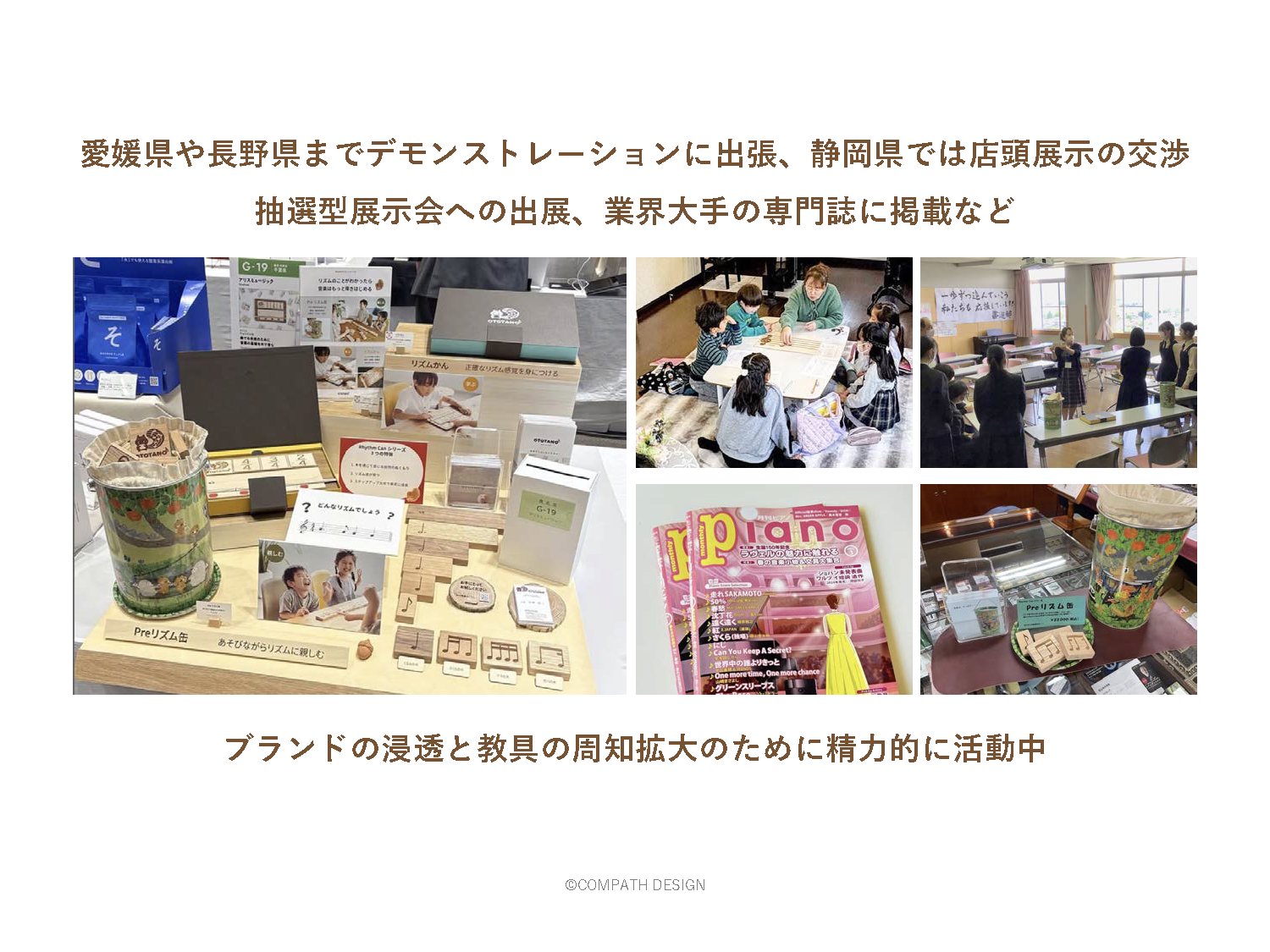 具体的には、リズムを楽しく学べる教具「RhythmCanシリーズ」など、⾳の⾼さや⻑さを段階的に習得することが可能で、天然の⽊材にこだわって木工職人が一点ずつ国内の工房で⼿作りした商品ブランド「OTOTANO」を開発。ブランディングは8ステップで実施し、ブランド・アイデンティティは「⾳楽をたのしむ⼼を育み、未来につながる基礎⼒を⾼める」と決めました。リンゴを持つリスをキャラクター化し、世界観をイラストで表現。ブランド指定書体やカラーを制定し、ウェブサイトやブランドブックなど各媒体におけるイメージの⼀貫性を意識しました。商品は、公式サイトや通販サイト、公式インスタグラムを活⽤して製品情報の告知や教室における指導⾵景の動画などの情報を積極的に発信。デモンストレーションのための出張や店頭展示の交渉、抽選型展示会への出展、業界大手専門誌への掲載などブランド浸透のための取り組みも精力的に行いました。