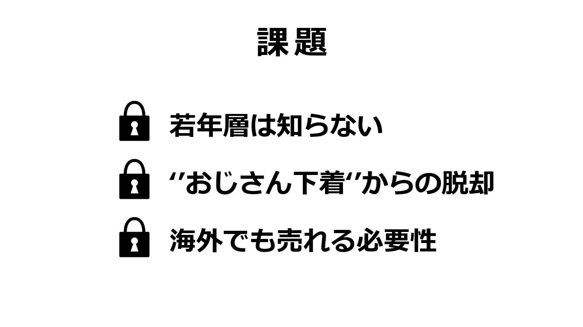 こうした中で、「ステテコというカテゴリー自体の再定義」を目指しブランディングに着手。「若年層への啓蒙」「“おじさん下着”からの脱却」「海外でも売れる必要性」という3つの課題から、楽しくかっこいいファッションアイテムとして位置づけるという定性的変化と、夏の定番アイテムとして市場に定着させ、販売数と市場規模の拡大を図り、新しいマーケットを作っていくという定量的変化の2つのゴールを設定しました。