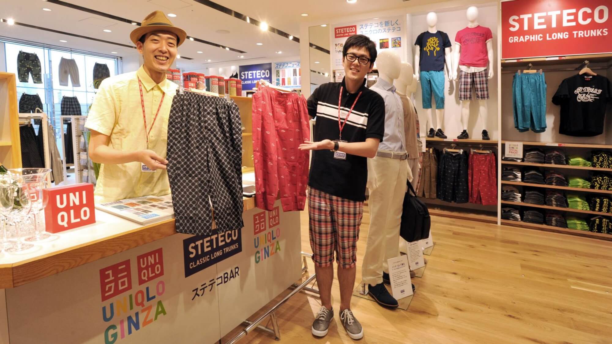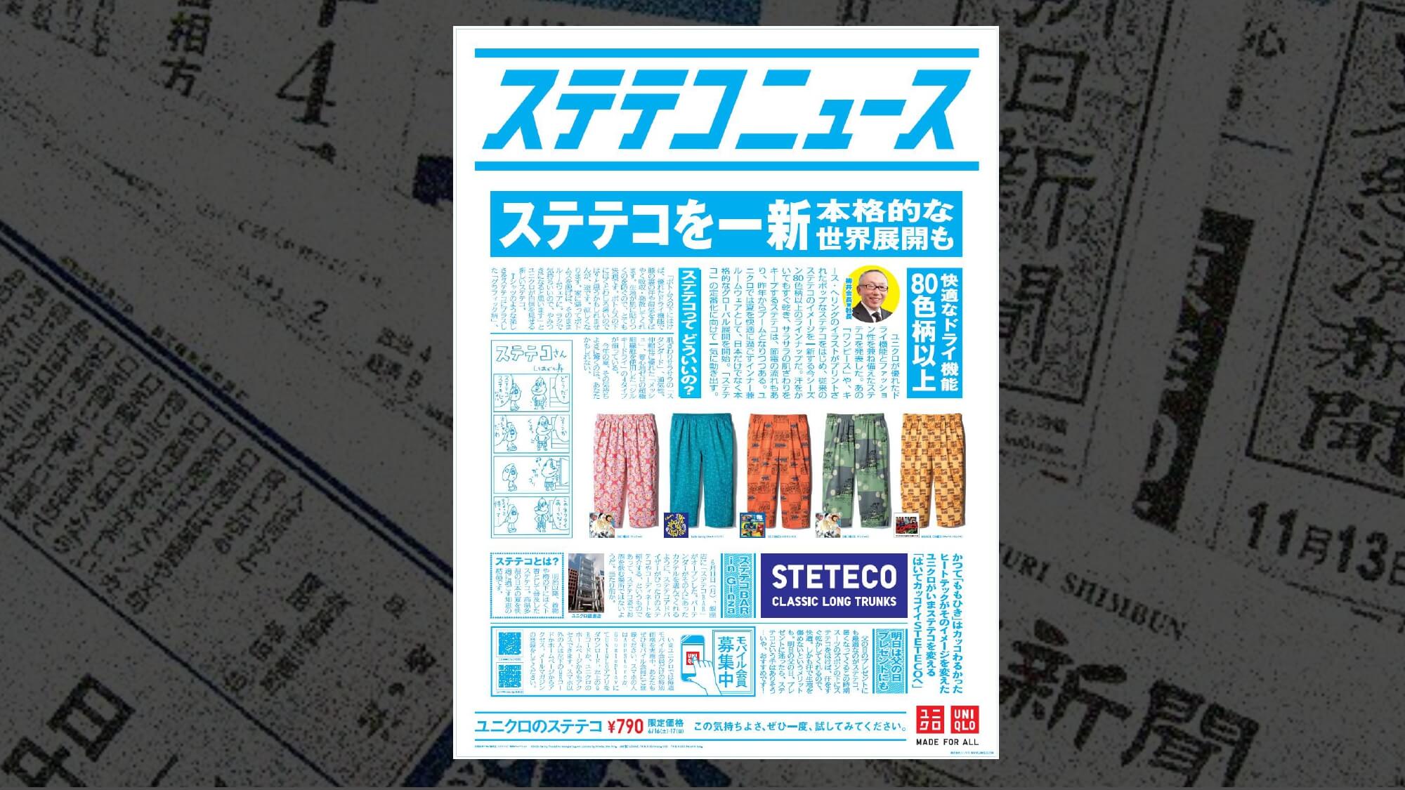 さらにコミュニケーション戦略は、「イメージ刷新」と「履き方の啓蒙」という2つの軸を設定し、「ステテコを新しく。ユニクロのステテコ」というコピーを開発。ステテコ刷新そのものをニュース化し、父の日には『ステテコニュース』と銘打った新聞広告を出稿。店内では「ステテコBAR」を設置し、店員がバーテンダーのように最適な色柄や履き方を提案する情報発信拠点を設けました。