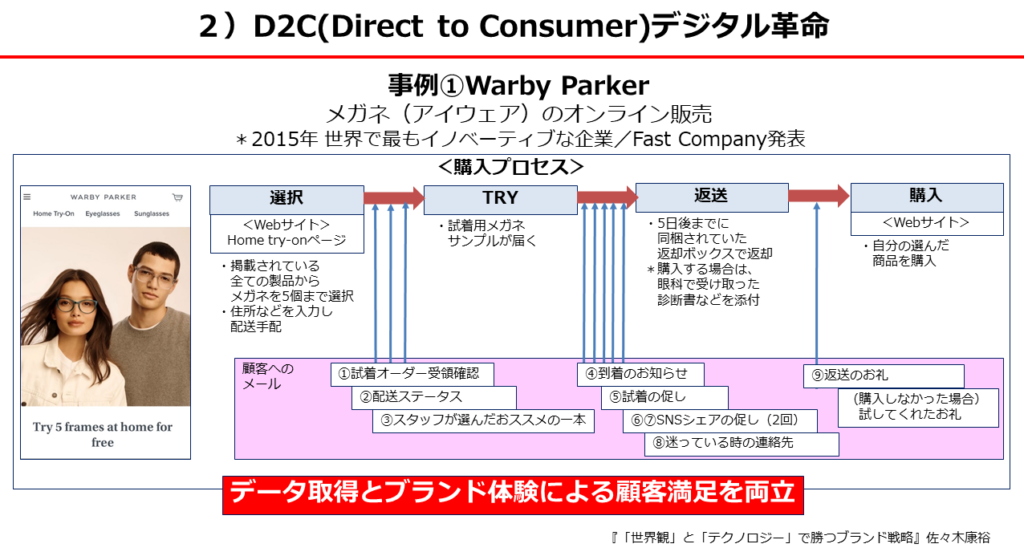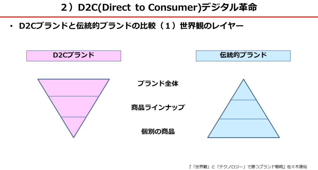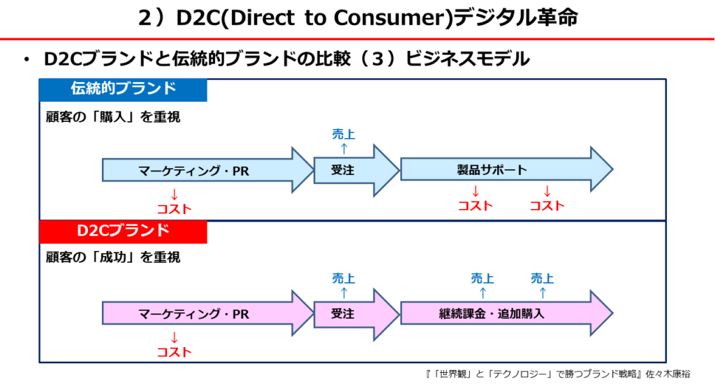 既存のビジネスモデルに後からデジタルを取り込む場合と比べると、リアルとデジタルの比重や構成に差があるかもしれませんが、D2Cモデルを知った上で、自社ブランドではデジタルをどこで取り込み、どこまで活用できるかを考えたほうが良いでしょうね。