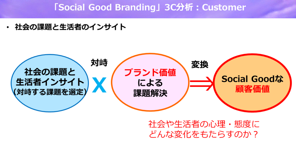 又、これは3C分析のCustomer(狭義の顧客だけでなく、広義の社会の範囲で)にあたりますが、下の図のように、どの課題にどのソリューション(企業価値)を提供することで、社会や生活者の心理・態度にどんな変化をもたらすのか?といった顧客価値への変換も必要です。
