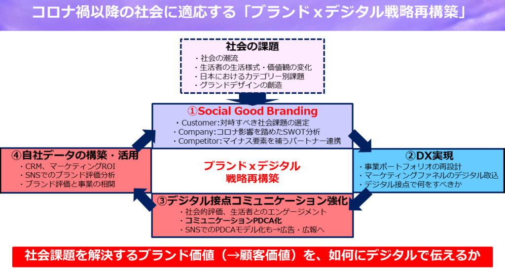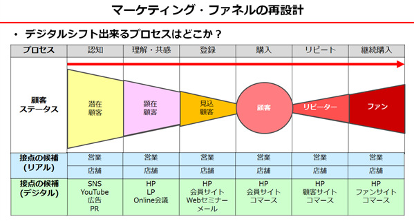 対峙する社会課題を選定→ブランドのコアコンピタンスの再確認→事業ポートフォリオの再設計を実施した上で、これまでのマーケティングファネルのどこにデジタルを取り込むか?を考える必要があります。