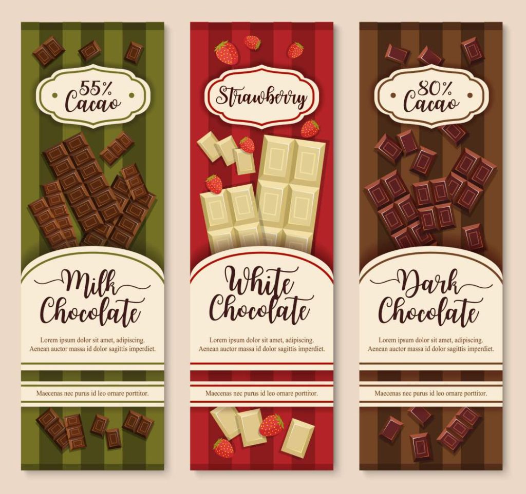 Chocolate packaging vector design set for black, white and dark chocolate bars with cacao percentage. Banners or chocolates bars and pieces with strawberry filling for cafe or confectionery