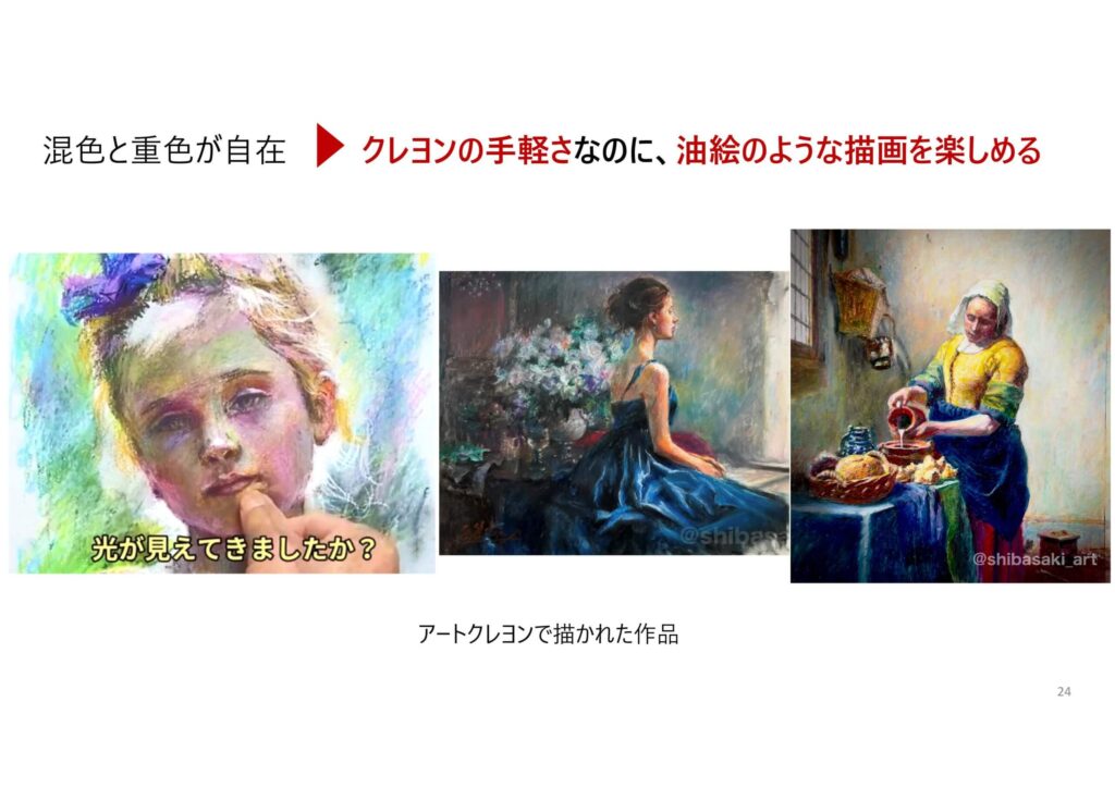 完成した「アートクレヨン」は、異なる色同士を混ぜ合わせてグラデーションや新しい色を作る「混色」と、暗い色の上に明るい色で鮮明な線を引く「重色」が自在で、クレヨンの手軽さで油絵のような描画が楽しめる独自の体験価値を提供する。
