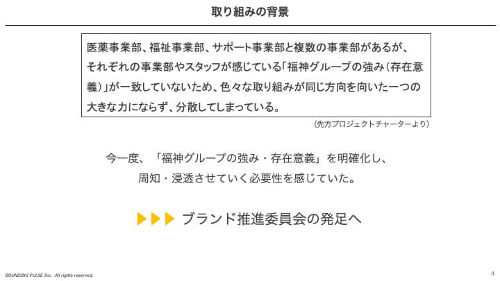 「調剤薬局のインターナルブランディング」は、医療と介護福祉で多角的に事業を展開する調剤薬局・福神グループが垣根を越えて組織を一つにするためにインターナルブランディングに挑んだ事例です。同グループでは、各事業部が感じている「福神グループの強み」が一致していなかったため、強みや存在意義を明確化して周知・浸透させる取り組みに着手。ブランド推進委員会(Brand Driving Force=BDF)を発足し、プロジェクトを進めました。