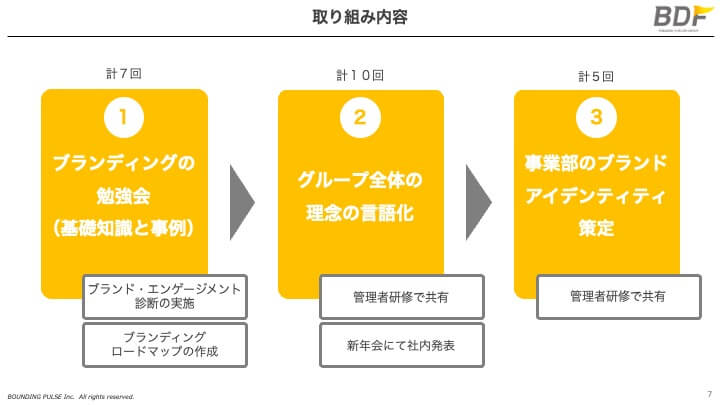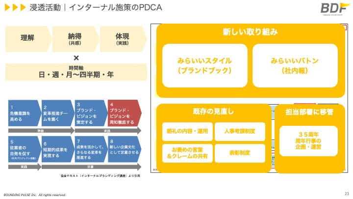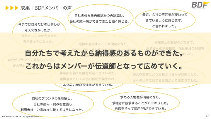 「事業部のブランド・アイデンティティ策定」では、ブランド構築ステップに基づいてブランド・アイデンティティまで各チームで作り、管理者研修でブランド体験まで考える形を採用。こうした取り組みの結果、BDFメンバーからは「自分たちで考えたから納得感があるものができた」などの声が寄せられ、ブランド・エンゲージメント診断では全体スコアがそれぞれ上昇傾向にあるという結果も得られました。