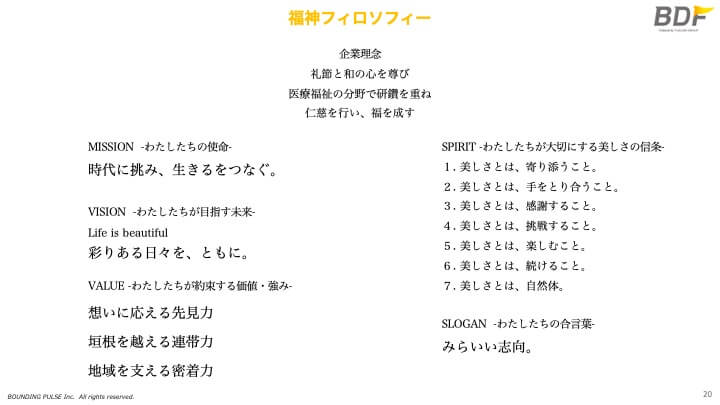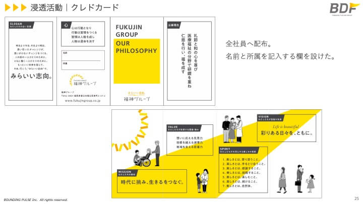 プロジェクトは「ブランディングの勉強会」「グループ全体の理念の言語化」「各事業部のブランド・アイデンティティ策定」の3段階で実施。「勉強会」は7回実施し、様々な角度からブランディングを学びました。また、「理念の言語化」ではミッション、ビジョン、バリュー、スピリットで言語化を進め、ミッションは、医療ビル・医療モールへの出店や福祉事業への進出などを「福神グループらしさ」と捉え、「時代に挑み、生きるをつなぐ。」に。ビジョンは「Life is beautiful 彩りある日々を、ともに。」と決めました。さらに、全体の理念を表す言葉として「みらいい志向。」というスローガンを設定。これらは既存の企業理念とともに「福神フィロソフィー」としてまとめ、社内リリースで発表しました。また、ブランドブック「みらいいスタイル」と社内報「みらいいバトン」を作成し、理念をまとめたクレドカードも配布しました。