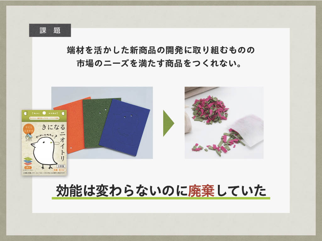 「暮らしの空間を「改臭」。 靴のニオイコンプレックスを さりげなく解消!」は、消臭商品で社会課題を解決し、人々の生活の質を向上させたいという強い思いから誕生した商品「KININARU NIOITORINO HASHIKKO(キニナル ニオイトリ ノ ハシッコ)」のブランディング事例です。ニオイ・カビを消臭・除菌する製品「きになるニオイトリ」を販売する老舗企業の太洋株式会社では、⽣産時に⼤量に出る端材には同製品と同等の効果があるので、これを有効活用できる製品化に着手。試行錯誤する中でTTDESIGNに相談し、生活雑貨大手小売店での販売を目指してブランディングに取り組みました。
