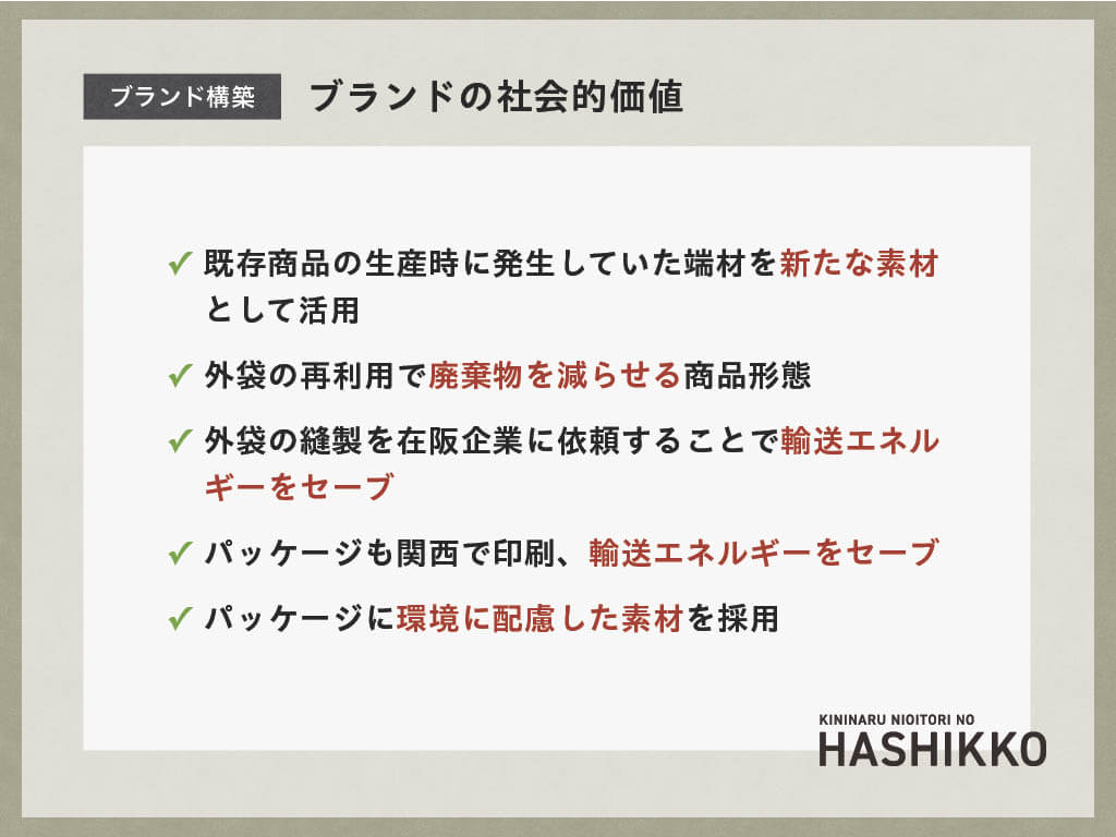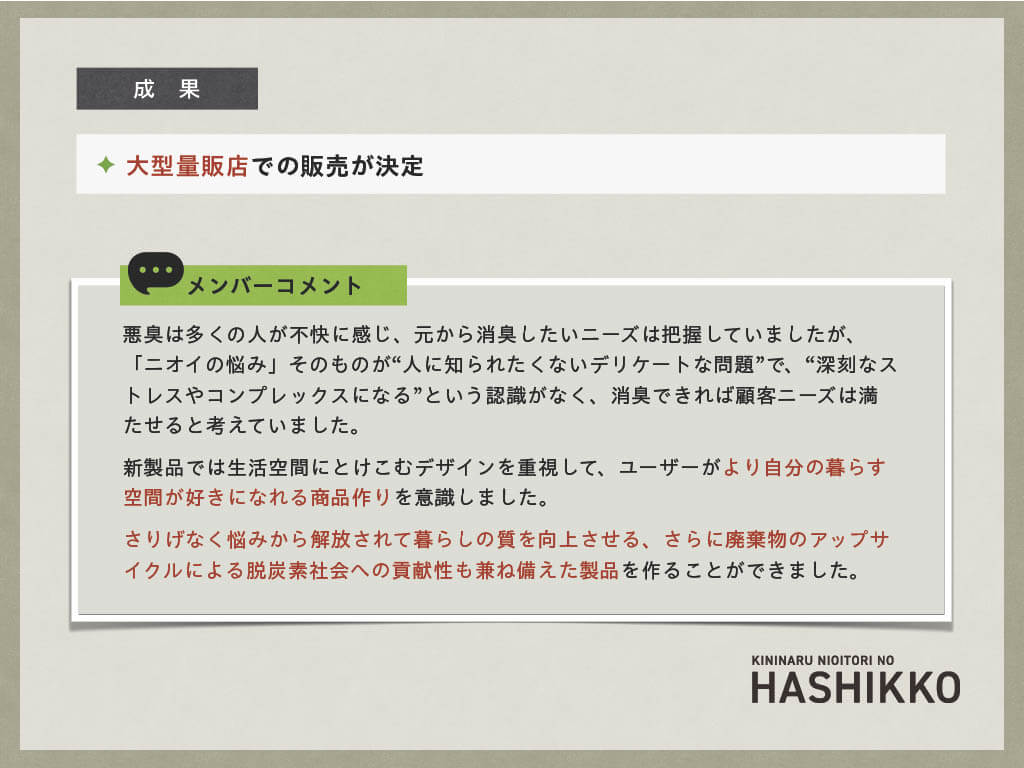 ブランド構築では、化学薬品の知見や経験が豊富であるなどの強みや、社員が少なく時間と人材のリソースが足りないなどの弱みを分析。サスティナブル消費や消臭・除菌・抗菌市場を市場機会と捉え、食品メーカーで企画営業を担当している30代の既婚女性をペルソナに設定。外袋1セット・消臭剤2セットで構成する新商品のブランド名を「KININARU NIOITORI NO HASHIKKO」とし、ブランド・アイデンティティは「暮らしの空間を『改臭』。一度つかったら手放せない商品」、キャッチコピーは「靴のニオイさよなら」と決定しました。
