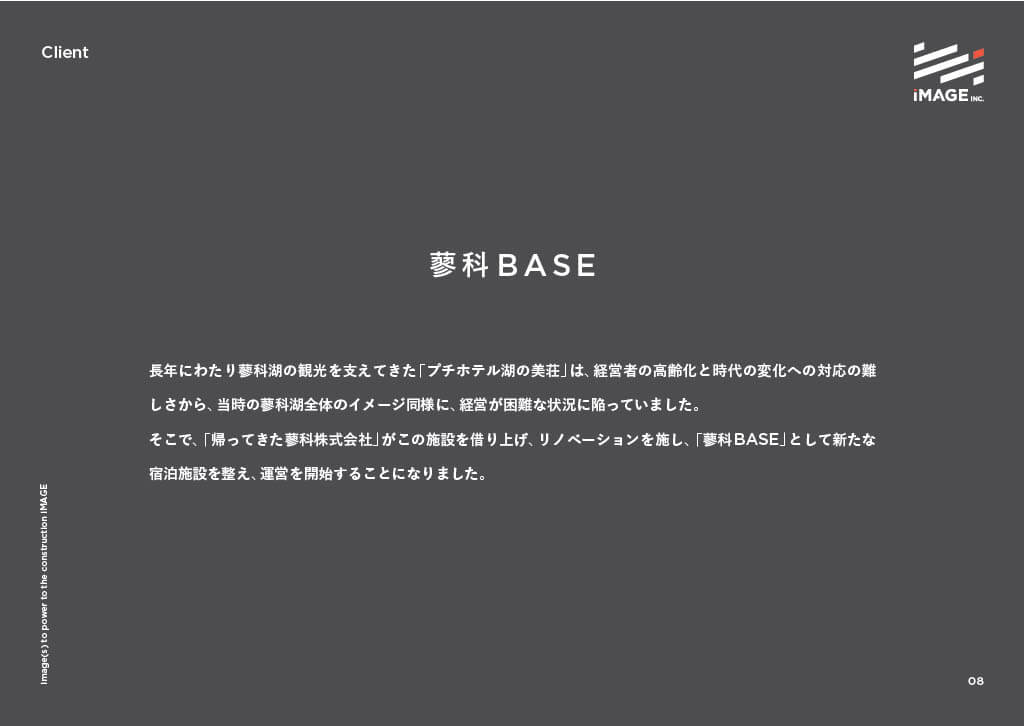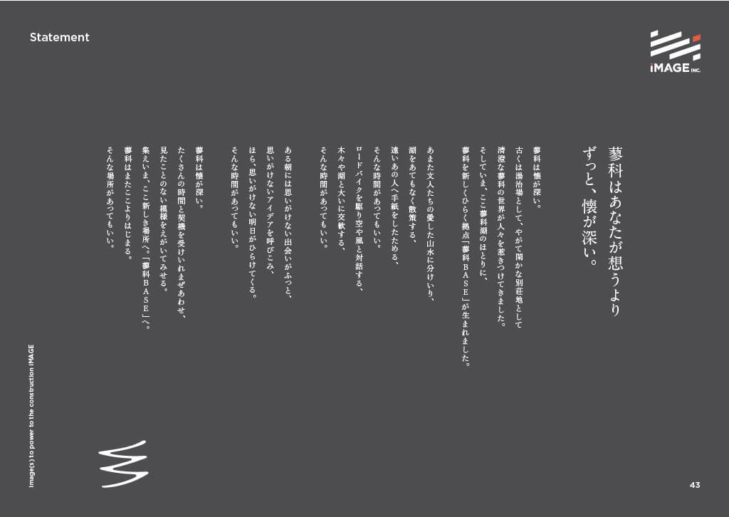 「蓼科はもう一度ここから生まれる。 多様な“時間”が行き交う“思いがけない”ほとり。」は、長野県蓼科地域の観光施設「蓼科BASE」のブランディング事例です。宿泊、飲食、スパなどのサービスを展開する「蓼科BASE」は蓼科地域の持つ潜在的な魅力を引き出し、新しい価値を提供する場として設立されましたが、地域の魅力が充分に発信されていないという課題があり、ブランディングに着手。「蓼科BASEを地域の中心的な観光地とし、訪れる人々に特別な体験を提供すること」「地域住民、移住者、観光客が交差し、新しい価値が生まれる場所とすること」をゴールに取り組みました。