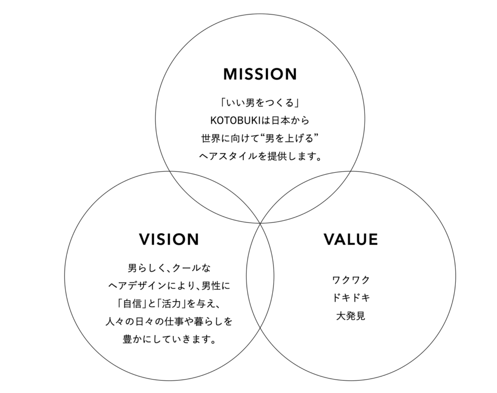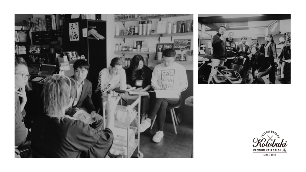 まず取り組んだのはインターナルブランディングです。チーフデザイナーである二代目を中心に、チームブランディングでコンセプト作りに着手。経営理念を見直し、3C分析を実施するなどブランド・マネージャー認定協会STEPを活用しました。その結果、KOTOBUKIがロサンゼルスへの定期的な社員旅行で最先端のヘアデザインを直輸入していることに着目し、「オトコのブランド力をアップするデザインセンス」というオンリーワンの魅力を発見。そこでブランド・アイデンティティは「自分ブランドを高め、プレミアムな男を作る洗練されたデザイナー」と決めました。さらに従業員のモチベーションアップのため、等級評価制度も見直し、「デザイナー」の名称を積極的に採用しました。