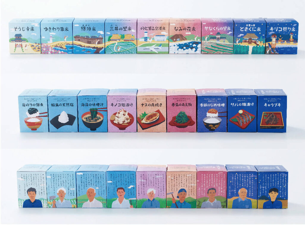それぞれ、能登輪島が誇る自然や祭りごとの風景を描き、生産者さんの似顔絵とおすすめのおかずも描きました。お米とおかず、食を通して輪島を旅し、魅力を感じ取ってもらいたい。そんな想いが込められた商品が誕生しました。