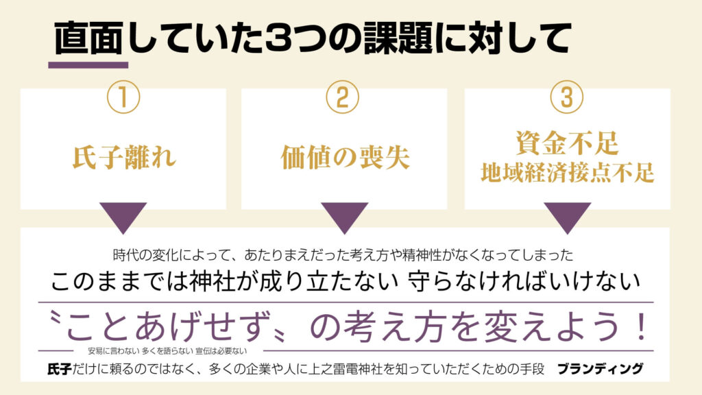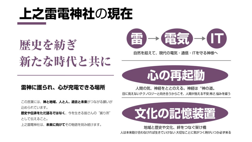 「神社が紡ぐ人と地域の未来 雷電神社の新たな価値創造への挑戦」は、古くから地域に根差す神社が継承・発展の道を選び、氏子離れや地域経済との接点不足などの課題解決に挑戦した事例です。埼玉屈指の由緒を持ち「電気の神様」として知られる上之雷電神社では、「氏子離れ」「価値の喪失」「資金不足と地域経済との接点不足」という3つの課題に直面しており、存続の危機にあったことから、ブランディングの取り組みを開始。“ことあげせず”という慣習的な考え方を変えて、氏子だけに頼るのではなく、神社の価値を社会へ伝えることに挑戦しました。