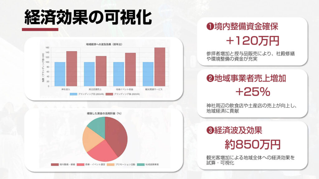 こうしたブランディングにより、若年層や家族連れの来訪が大幅に増加。イベント参加も増え、3年前との比較でおみくじは12倍、ご祈祷は7倍に増加しました。また、毎日参拝者があり、神社境内の空気が変化。境内整備資金の確保にも成功し、地域のイベントでの店舗売り上げも向上。観光客の増加により約850万円の経済波及効果を生みました。