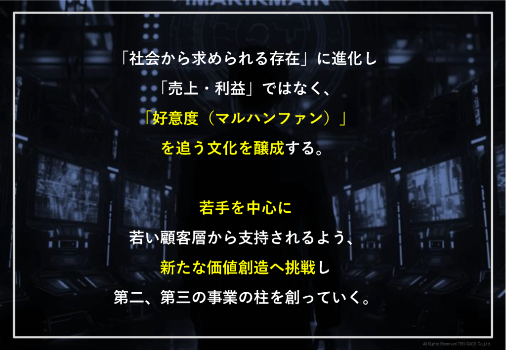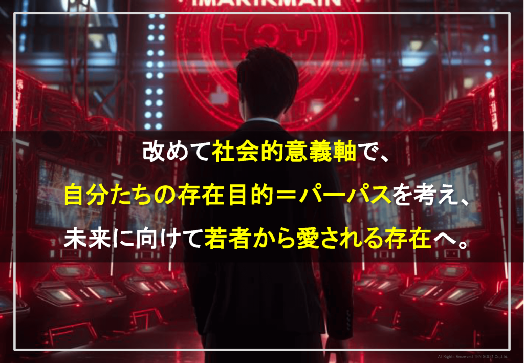 「『マルハン=パチンコ』からの脱却へ!第二創業に向けたパーパス・ブランディング」は、パチンコ事業を手掛ける株式会社マルハンがパーパス経営で新たな価値創造へ挑戦した事例です。パチンコ業界は法規制やコロナの風評被害などでユーザー離れが進み、顧客と従業員ともに若者層が離れている状況にあります。そんな中、「マルハン=パチンコ」というイメージから脱却して若者から愛される存在へと舵を切るため、パーパス経営によって「売上・利益」ではなく「好意度(マルハンファン)」を追う文化を醸成することを決断。第二、第三の事業の柱を創る取り組みに着手しました。