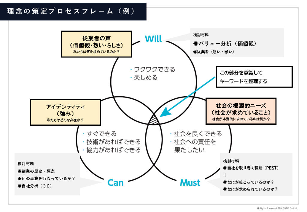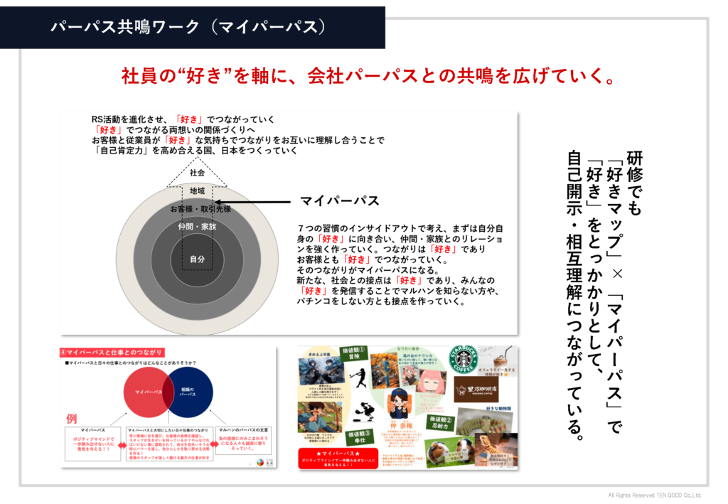 まずは幹部層で半年をかけて未来について「WILL・MUST・CAN」を軸にディスカッションし、新たな存在意義を構成するキーワードを抽出。777の案を作成し、「人とつながりの力で、人生100年時代に生きるヨロコビを創造する。」というパーパスを決定しました。社会的価値は「心の健康」にフォーカスし、「一人ひとりの存在・好き(趣味嗜好)を承認・応援し、人間らしく自分らしく生きる上での心の豊かさとをつながりを提供していく」としました。