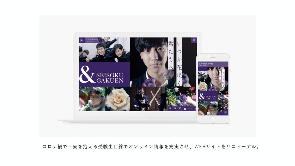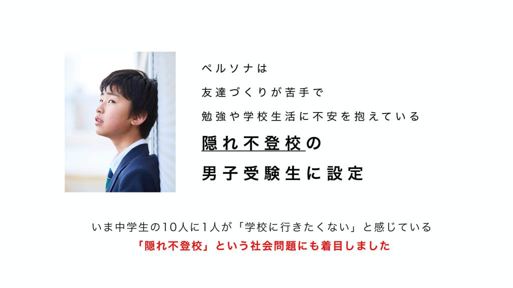 そこでブランド構築では、いじめを許さない校風や男子だけの気楽な学校生活、生徒の不安な気持ちに寄り添える安心な環境などの魅力に着目し、ペルソナを「友達づくりが苦手で、勉強や学校生活に不安を抱えている隠れ不登校の男子受験生」に設定。ブランド・アイデンティティは「安堵できる環境で 友と共に成長し 個性を伸ばせる男子校」、タグラインは「繋がる『&』から伝わる『安堵』へ」と決め、「&SEISOKUGAKUEN」というブランド名を掲げました。