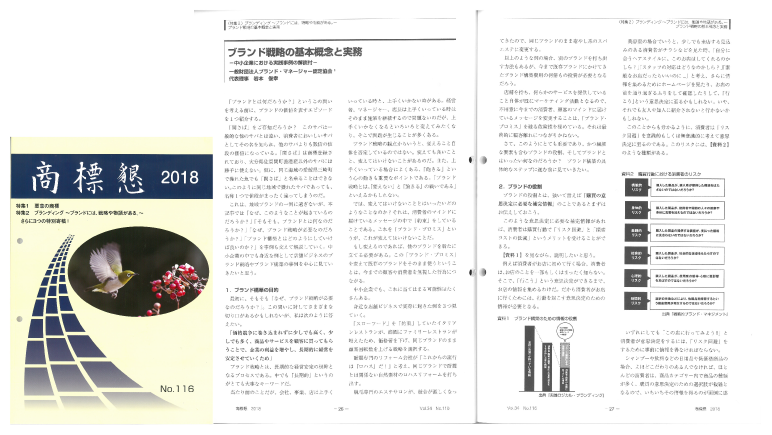 特許庁商標懇親会が発行する、『商標懇 2018 No.116』に、代表理事岩本が執筆した「ブランド戦略の基本概念と実務」が掲載されました。