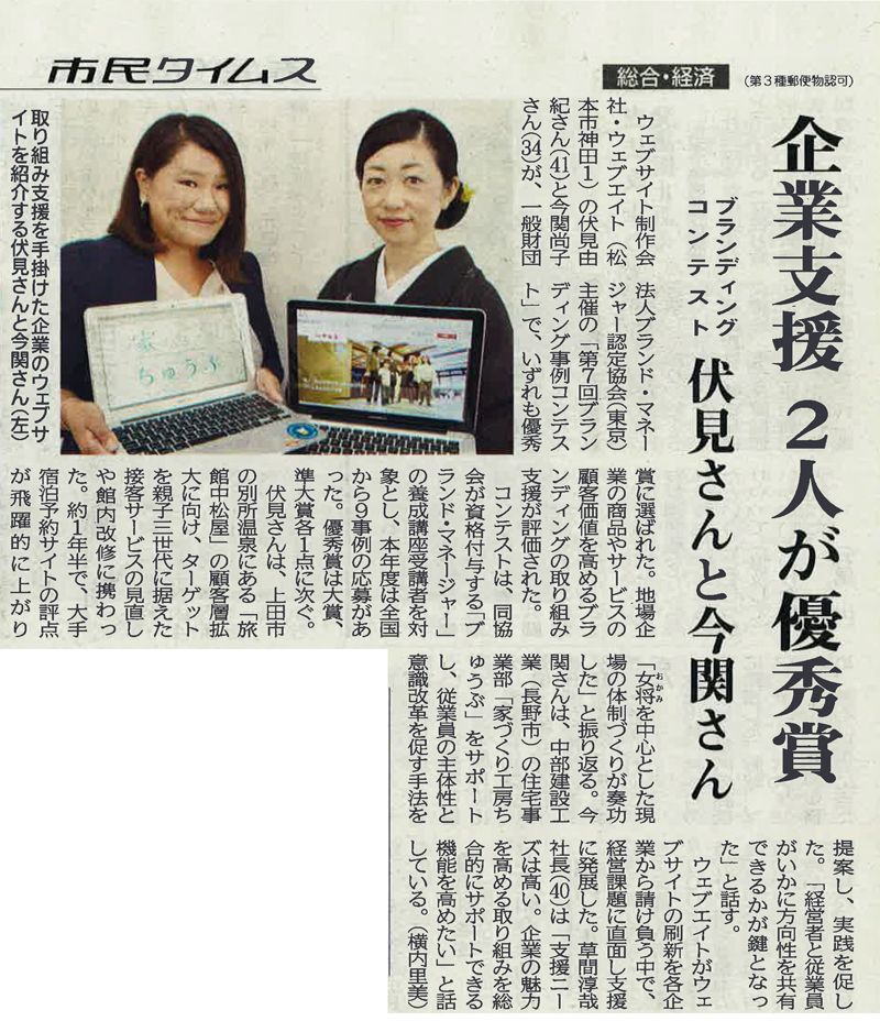 市民タイムス9月5日号に、ブランディング事例コンテストで優秀賞を受賞された、 株式会社ウェブエイトのお二人が紹介されました!