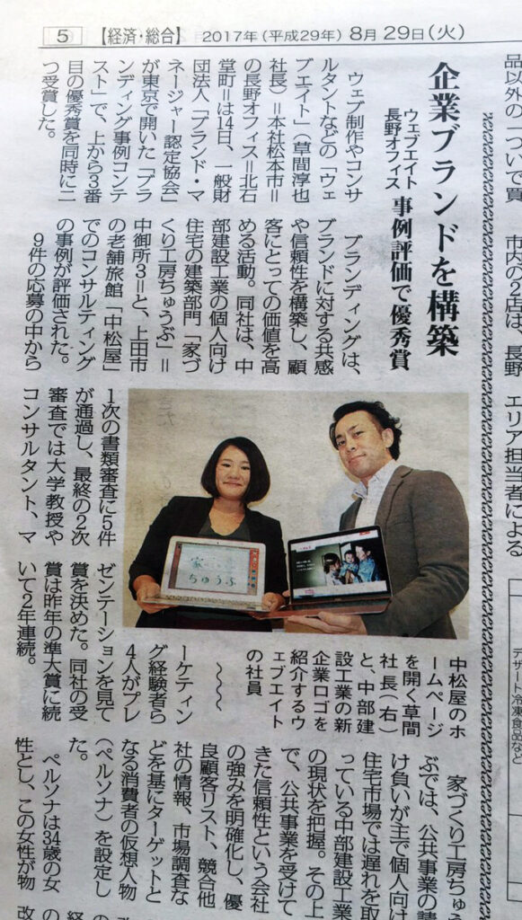 長野市民新聞8月29日号に、ブランディング事例コンテスト優秀賞を受賞された、 株式会社ウェブエイトさんが紹介されました!