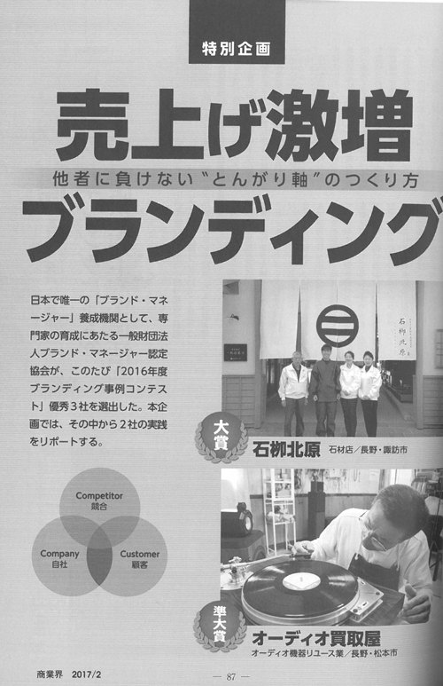 商業界2017年2月号に、2016年度ブランディング事例コンテストで大賞を受賞された「石柳北原」の事例と、準大賞を受賞された「オーディオ買取屋」の事例が掲載されました。