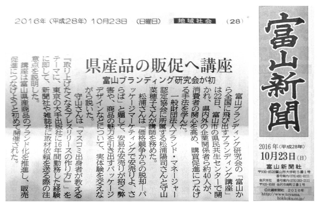 富山新聞10/23号に、協会トレーナーが主催した「富山から全国に飛び出すブランディング講座」の記事が掲載されました。