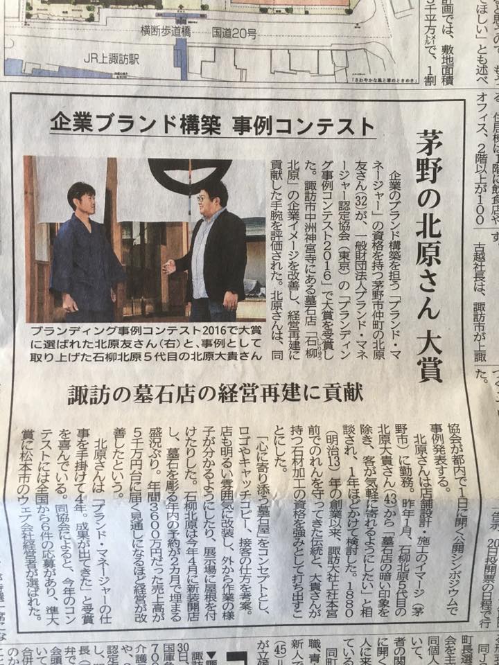 2016年度ブランディング事例コンテストで大賞を受賞された、株式会社イマージの北原友さん(当協会トレーナー)と石柳北原の5代目北原大貴さんが、信濃毎日新聞の取材を受け10/1号にその内容が掲載されました。