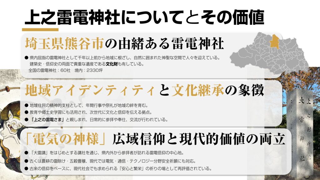 舞台となる埼玉県熊谷市にある上之雷電神社は、「電気の神様」として知られており、古くは雷よけ、現代では電気や通信安全を祈る信仰もある、埼玉屈指の由緒を持つ神社です。