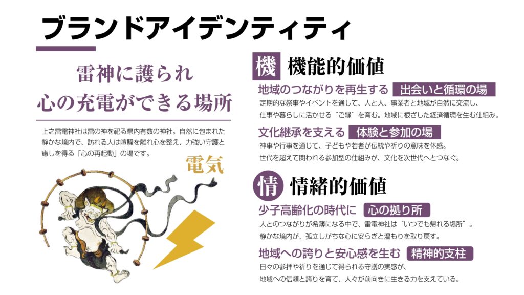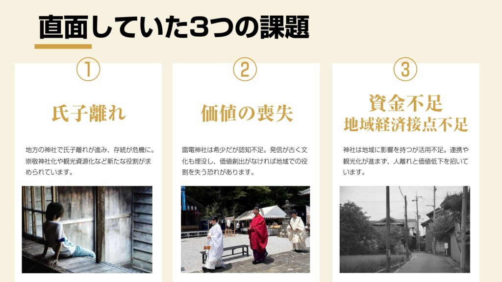 上之雷電神社では「氏子離れ」「価値の喪失」「資金不足と地域経済との接点不足」という課題に直面しており、希少な存在でありながらも認知されておらず、存続の危機にあったのです。