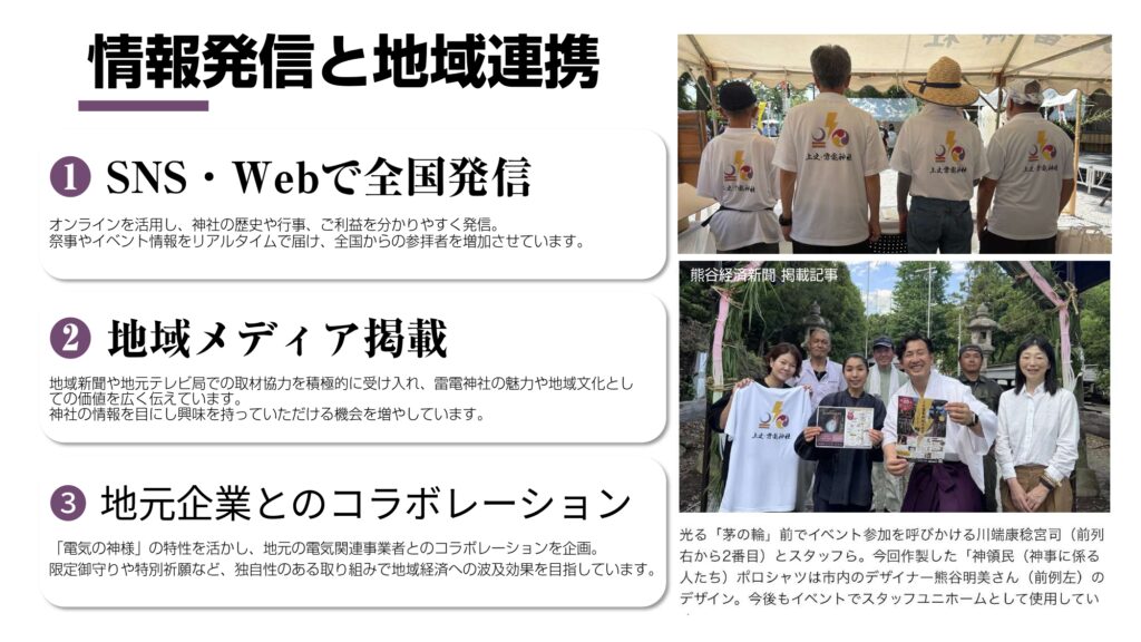 そして情報発信と地域連携では、SNSやWebで神社の歴史や行事、ご利益をわかりやすく発信するほか、祭事やイベント情報をリアルタイムで届けることで参拝者増につなげています。