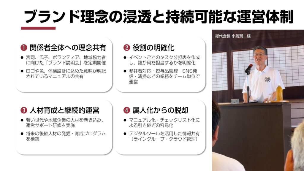 ブランド理念の浸透と運営体制についてお話しすると、まず関係者全体への理念共有のため、宮司、氏子、ボランティア、地域協力者の方々に向けた「ブランド説明会」を定期開催するようにしています。