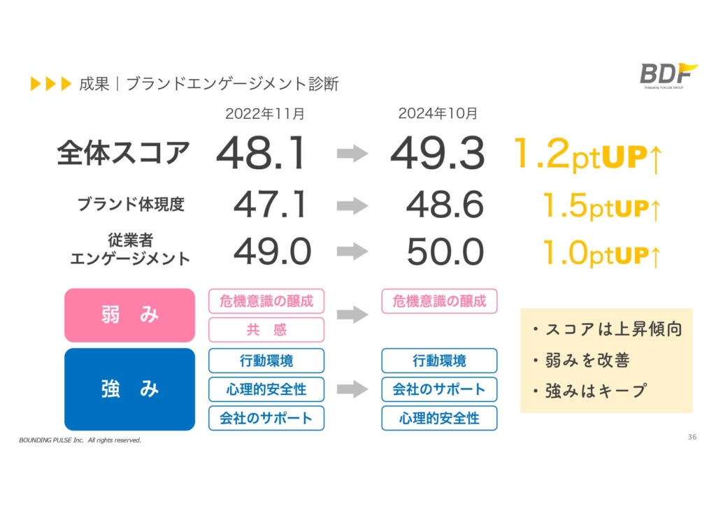 また、2022年11月と2024年10月に実施したブランド・エンゲージメント診断では全体スコアが上昇傾向にあるなどの結果も出ており、弱みを改善しつつ強みはキープできていると考えています。