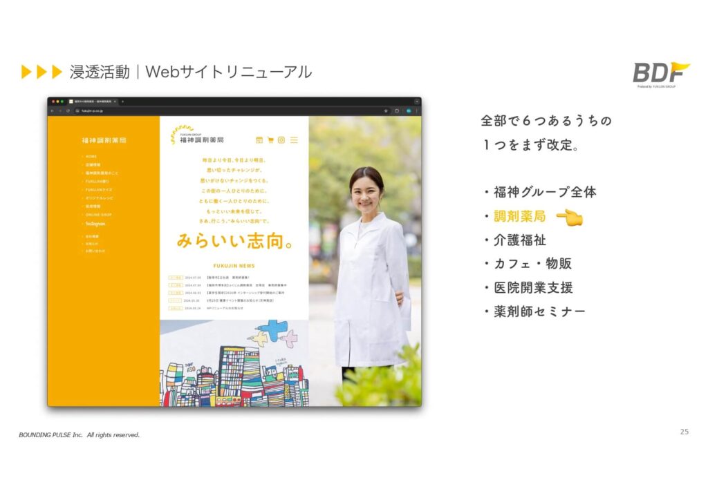 クライアントの「福神グループ」様は地元福岡の地域密着企業で、調剤薬局や福祉施設をはじめ在宅医療、薬局併設のカフェ、オリジナル商品の開発、クリニック開業支援など幅広く事業を展開されています。