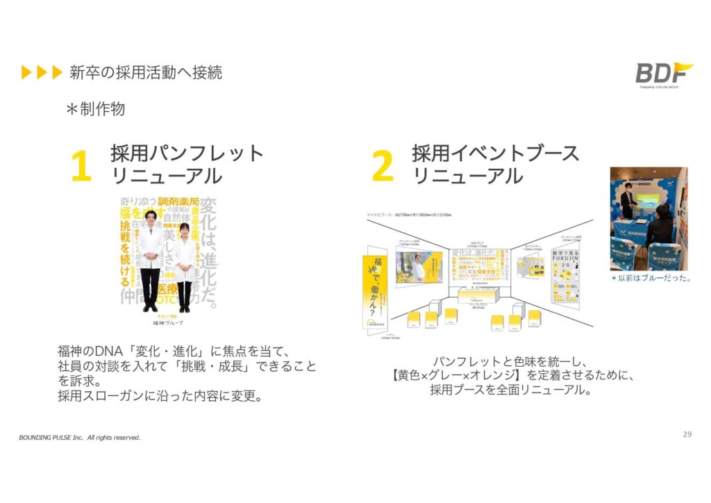 一例を挙げると、薬剤師の新卒採用では「変化は、進化だ。挑戦は、成長だ。」というブランド・アイデンティティをそのまま採用スローガンとして活用し、それをベースに採用パンフレットをリニューアルしたほか、説明会の採用イベントブースもリニューアルしています。