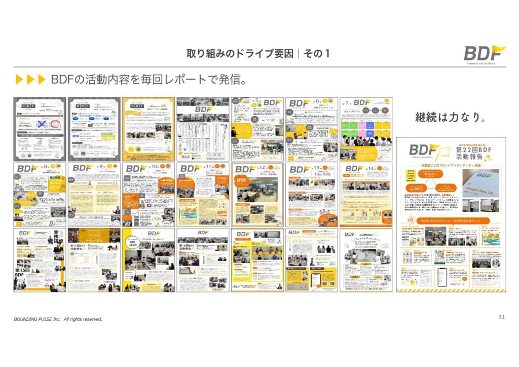 まず1つめは、BDFの活動内容を毎回レポートで発信していたこと。
