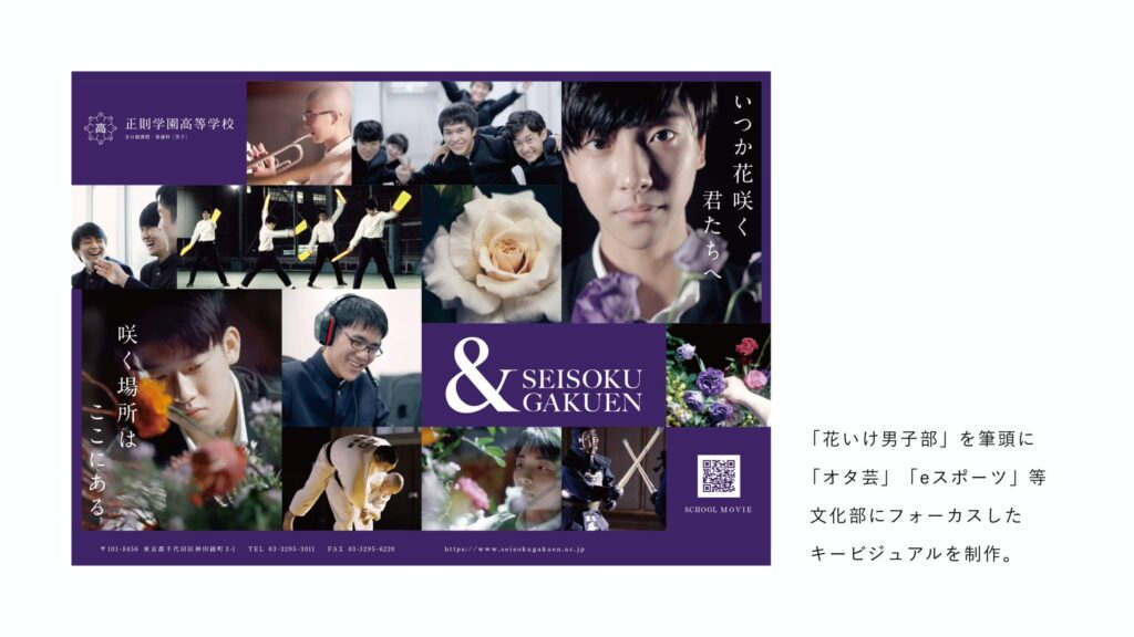 まず、花いけ男子部を筆頭に、オタ芸やeスポーツなど、文化部にフォーカスしたキービジュアルを制作したほか、男子とは縁遠い花を学校案内の表紙にするなど、これまでの男子校イメージを大きく変えるものを作りました。
