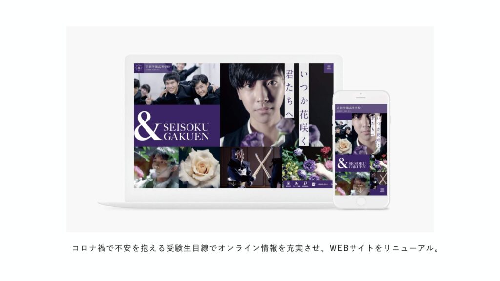 これらのことを踏まえ、ブランド・アイデンティティは「安堵できる環境で、友と共に成長し、個性を伸ばせる男子校」と決めました。そしてタグラインは、「繋がる『&』から伝わる『安堵』へ」とし、「&」を強調した「&SEISOKUGAKUEN」というロゴマークを設計。