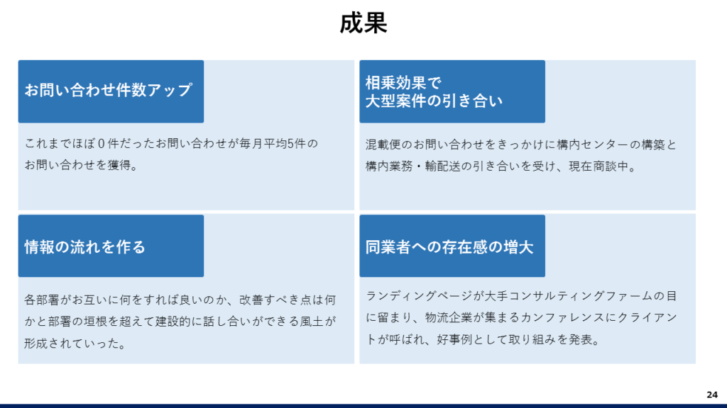 また、混載便事業へのお問い合わせをきっかけに、相乗効果で「組立・検査事業」も含んだ内容のお問い合わせをいただくなどの成果も得られています。