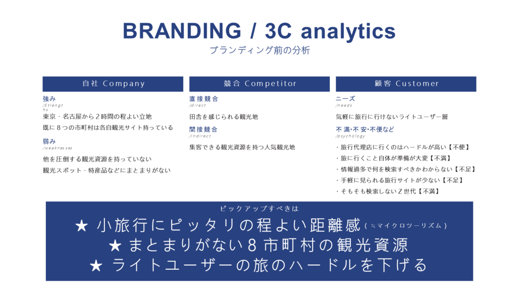 プロジェクトでは、まず3C分析を行い、同エリアの魅力が東京、名古屋から約2時間半でアクセスできる点に注目しました。