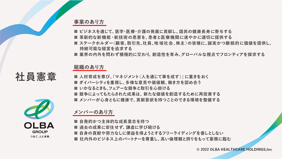 社員憲章では、「事業のあり方」「組織のあり方」「メンバーのあり方」という項目ごとに、グループに所属する社員のあるべき姿を示していたんです。