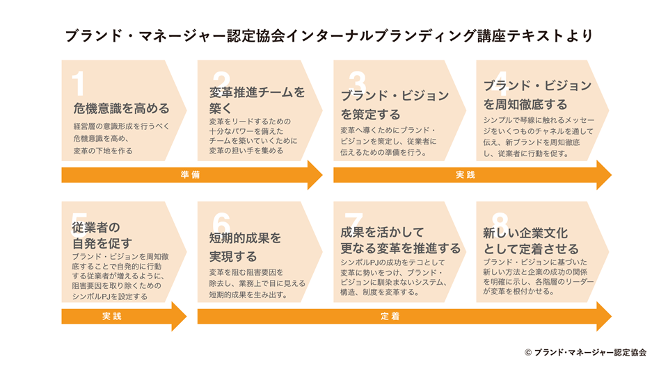 そこからのプロジェクトの流れは、ブランド・マネージャー認定協会のインターナルブランディング講座のテキストにある「8つの企業変革プロセス」に基づいて段階的に進めていきました。