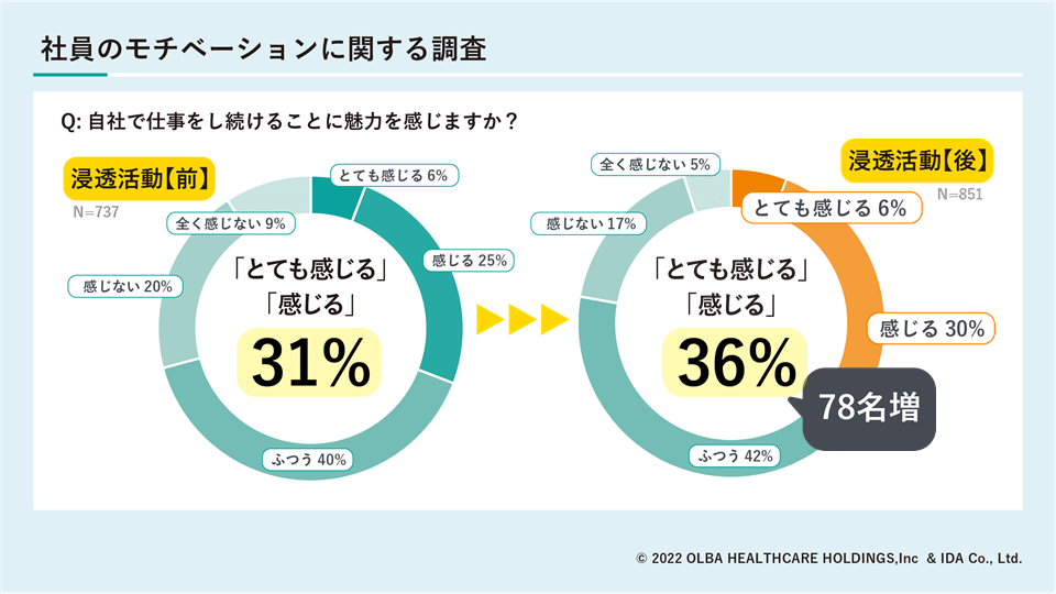 また、社員のモチベーションについても、「仕事をし続けることに魅力を感じますか?」という質問に対し、浸透活動前は「とても感じる」「感じる」の合計が31パーセントでしたが、活動後は36パーセント、5ポイントアップという結果になりました。